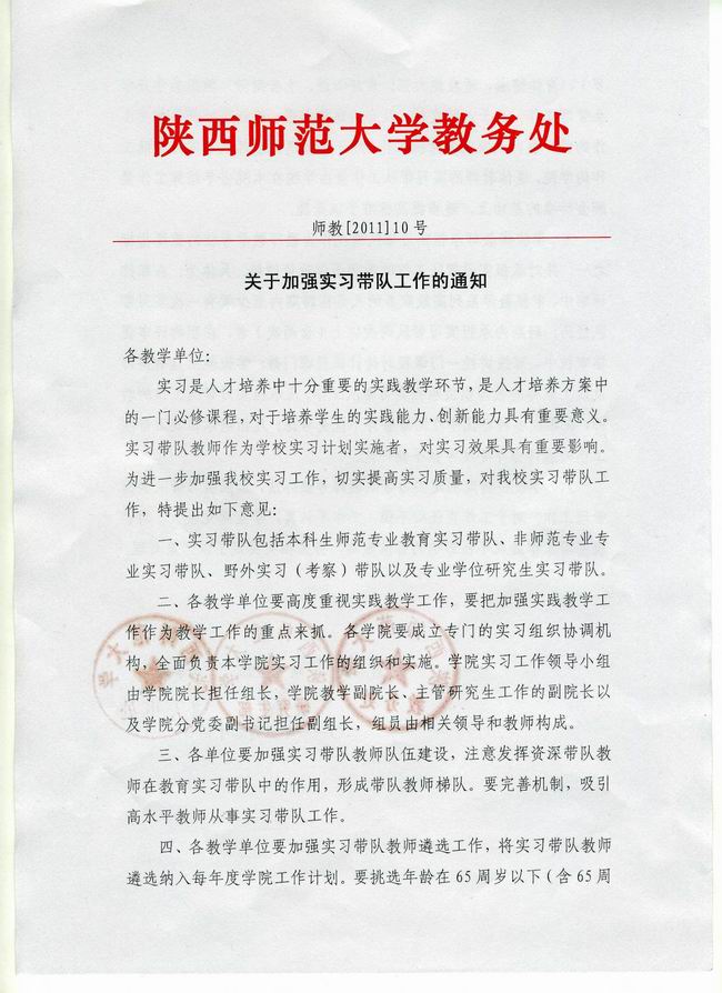关于遴选2011年秋季学期教育实习带队教师的通知