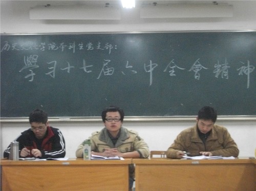 2011年11月25日,08级博物馆班在文渊楼534教室开展了关于学习党的十七届六中全会精神的讨论活动。本次讨论由博物馆班团支部书记刘珊主持。 本次讨论主要围绕十七届六中全会审议通过的《中共中央关于深化文化体制改革...