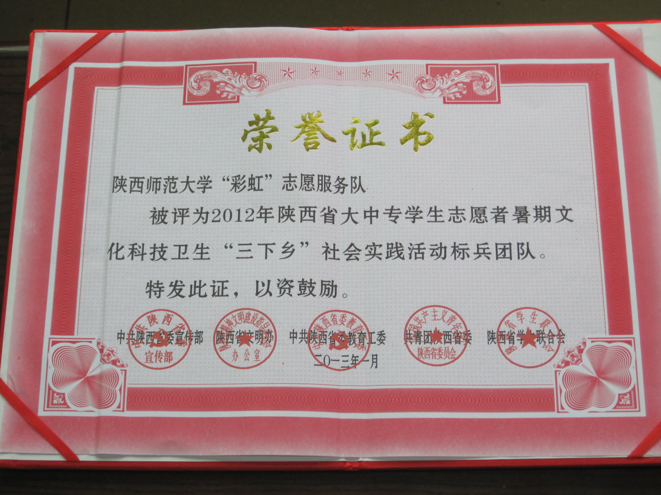 喜报 2012年暑期学院团委响应校团委以“青春九十年,报国永争先”为主题的大学生暑期文化科技卫生“三下乡”社会实践活动号召,组织了“彩虹”志愿服务队,于2012年7月暑假,至陕西省渭南市华县高塘镇北村中心小学,...