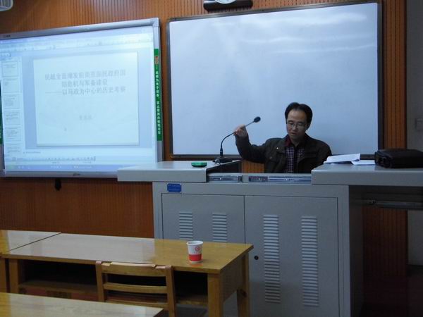2014年4月23日晚上七点,威尼斯欢迎你welcome研究生会日新论坛七十七讲在文津楼504教室顺利举行。本次讲座邀请的是威尼斯欢迎你welcome博士研究生,毛光远博士担任主讲,其主讲主题为《抗战全面爆发前南京国民政府国防危机凸显与军...
