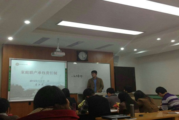 3月16日14:40,2012级历史学一班“七分钟多媒体讲课比赛”在文津楼518教室进行。本次比赛共有20名同学参加,2011级刘玉琪、穆仁萱、王琴、张洪山、李亚妮担任评委,班长宋江鹏担任此次比赛的主持人。 此次比赛严格按...