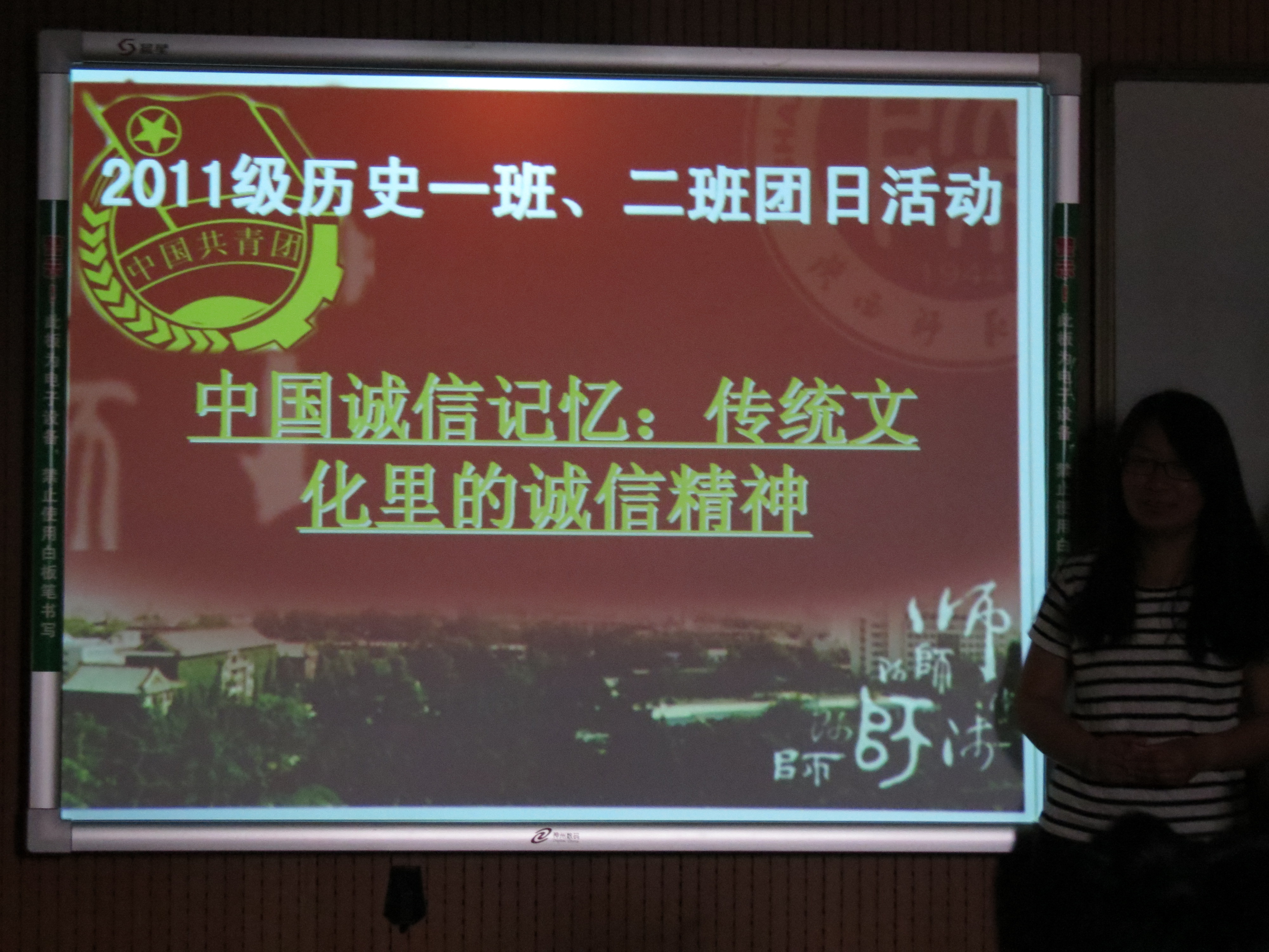4月24日星期二晚上19:00-21:00,2011级历史学一班和二班在文津楼615教室联合举办了以“中国诚信记忆:传统文化里的诚信精神”为主题的团日活动。此次活动由历史一班团支书李亚妮和二班团支书于永洋主持。 诚信...