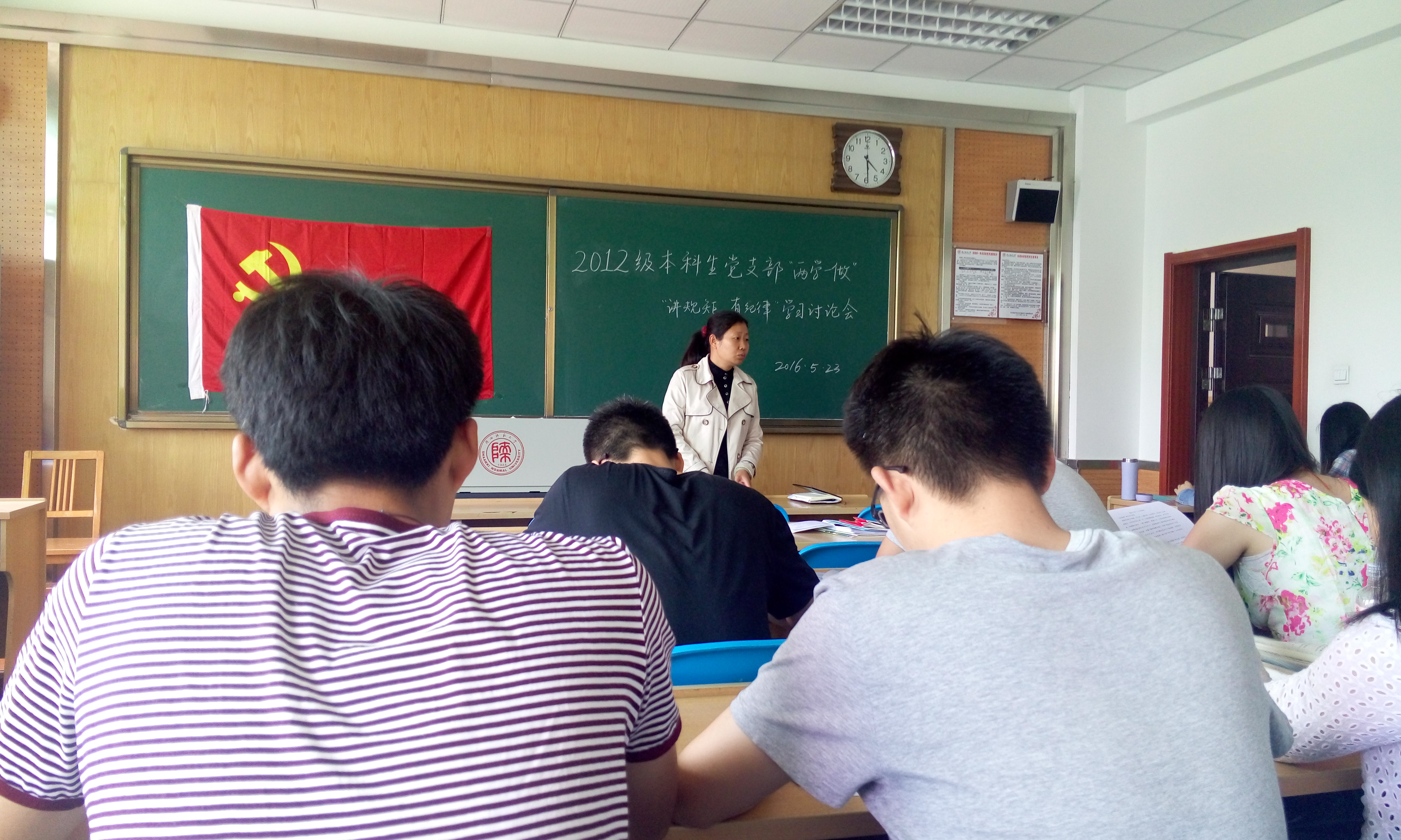 2016年5月23日星期一下午,威尼斯欢迎你welcome2012级本科生党支部在文渊楼3303教室召开了“两学一做”“讲规矩、有纪律”学习讨论会。 会议由支部副书记陈丽媛同志主持,首先是支部书记洪海安老师发言。洪老师先对党支部各...