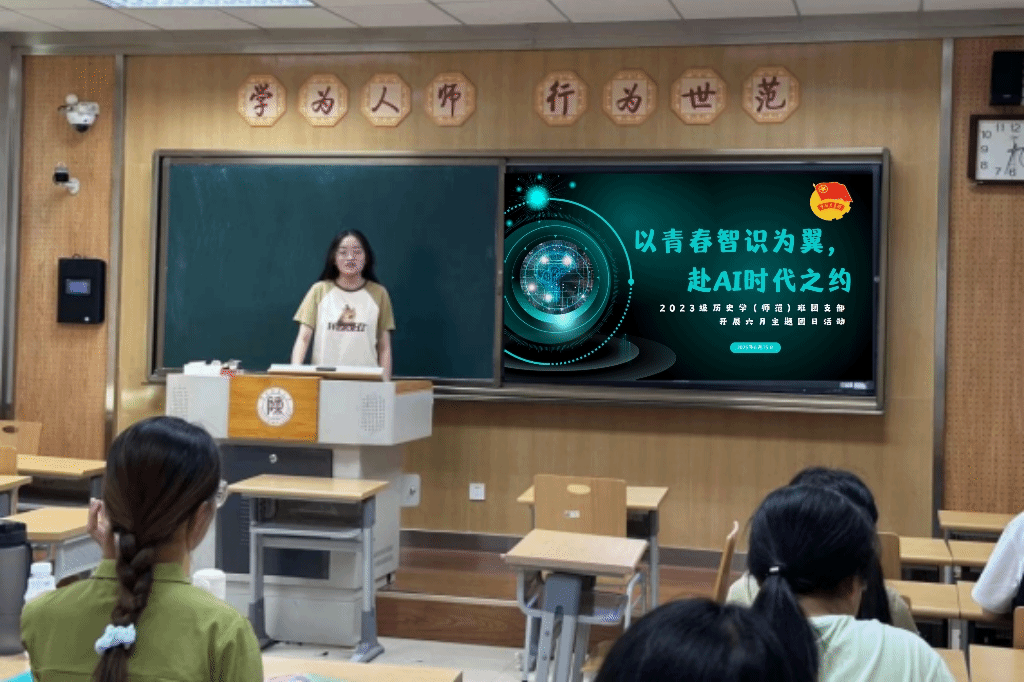 6月15日,2023级历史学(师范)班团支部开展“以青春智识为翼,赴AI时代之约”主题团日活动。团支部书记通过播放短片向支部成员生动展现人工智能在多领域的广泛应用与发展前景。随后,第一团小组带来情景剧《浪潮中的思考者》,各支部小组围绕情景剧表演中过度依赖AI和正确引导使用人工智能的问题,进行深度研讨。最后,团支部书记进行总结,并向支部成员发出倡导,合理使用AI,传承人文温度。通过本次团日活动,支部成员深化对AI的认识,强化坚守人文价值、以教育点亮科技未来的使命,决心为科技强国建设贡献力量。