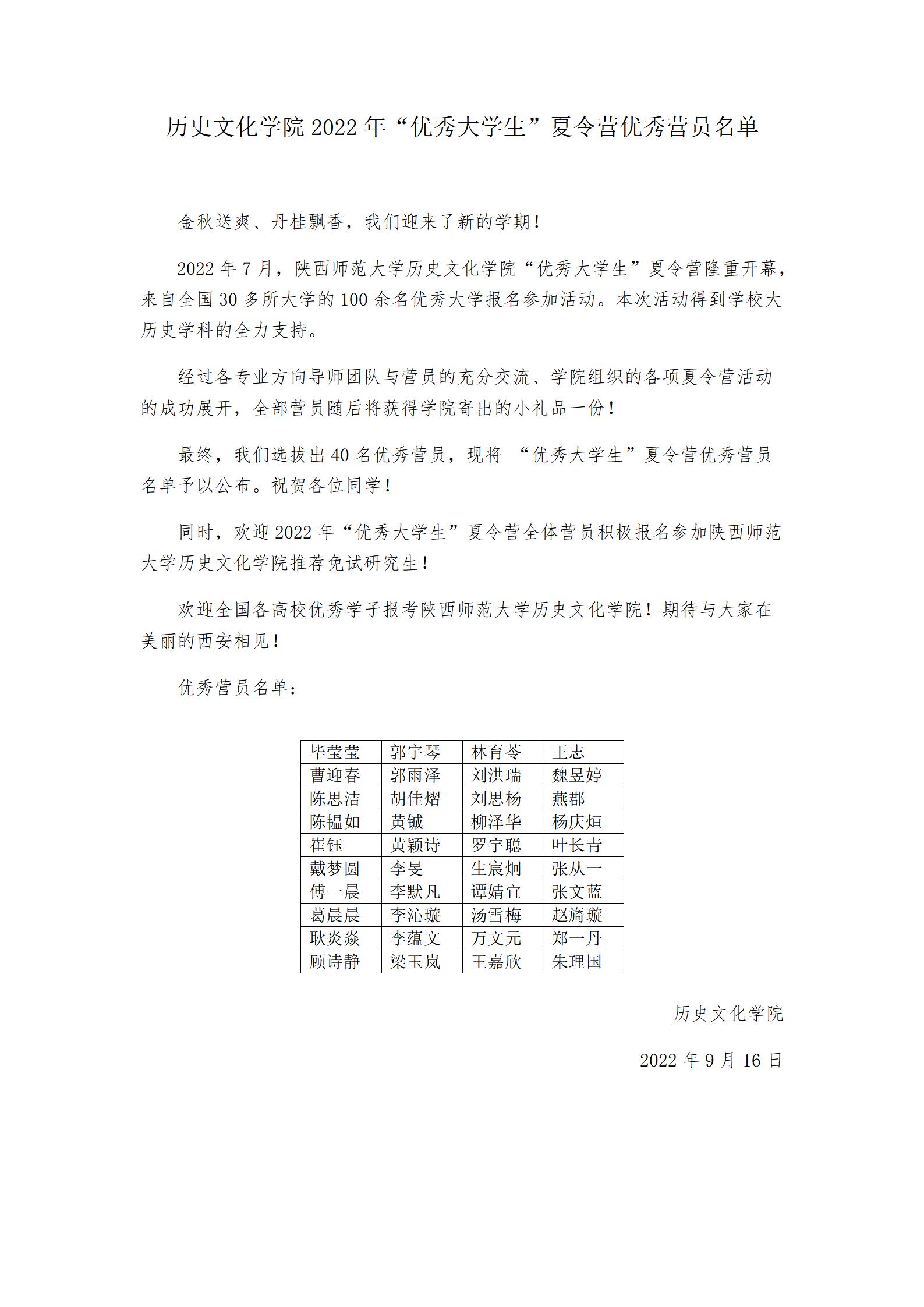威尼斯欢迎你welcome2022年“优秀大学生”夏令营优秀营员名单