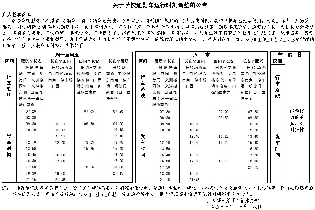 关于学校通勤车运行时刻调整的公告