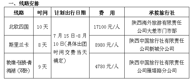 为进一步贯彻落实《教师法》精神,丰富教职工暑期文化生活,学校工会根据工会本年度工作安排,于今年暑假期间继续组织教职工进行旅游休息休养活动。在听取教职工建议及市场调研的基础上,5月20日询价会确定了相关线路、承接旅行社及价格。现将活动有关事宜通知如下:
