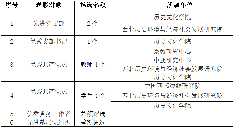 根据学校组织部《关于评选表彰优秀共产党员、优秀党务工作者、优秀党支部书记和先进基层党组织的通知》,通知见师大首页通知,链接:http://www.snnu.edu.cn/info/1085/20993.htm,结合各单位具体情况,经学院党委会研究决定,具体名额分配情况如下: