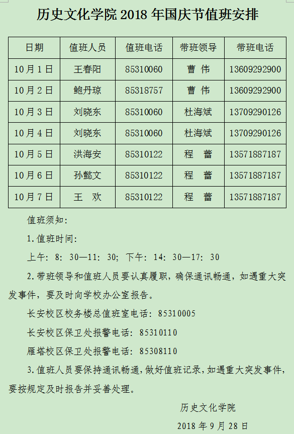 威尼斯欢迎你welcome2018年国庆节值班安排
