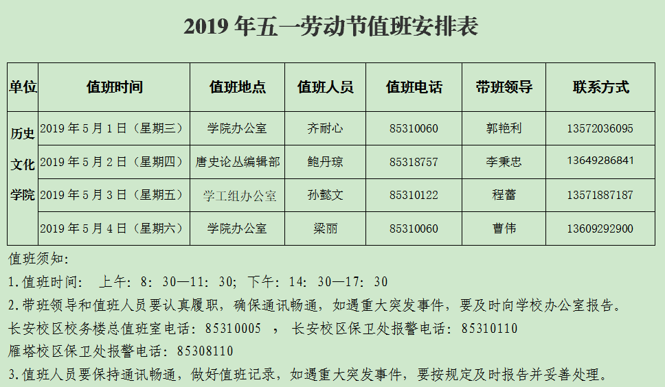 2019年五一劳动节值班安排