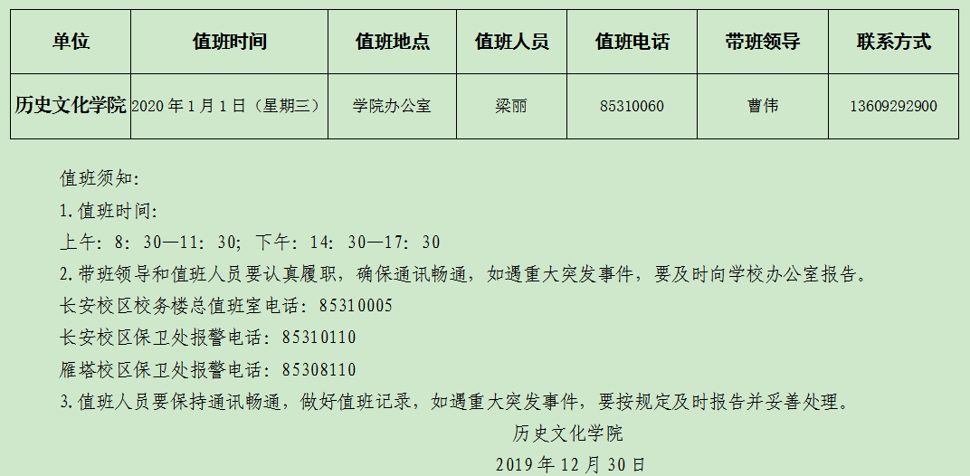 2020年元旦值班安排表