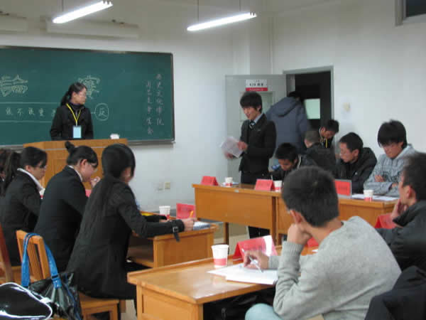 辩论赛开始,主持人首先介绍了到场的嘉宾评委,然后正、反双方选手分别进行了自我介绍。接下来,由辩论赛主持人宣读了赛制、赛规。辩论双方以“圆明园该不该重建”为题进行了辩论。在立论阶段,正方古典文献班选手围绕自己的辩题“圆明园应该重建”陈述了自己的观点,反方历史一班选手围绕“圆明园不该重建”陈述了自己的观点,在经历了攻辩、小结、自由辩论、观众提问这几个阶段之后,正反方分别总结陈词,最后由评委们进行了精彩的点评。此次辩论赛杨云同学获得了“最佳辩手”的称号,正方古典文献班赢得了此次辩论赛。