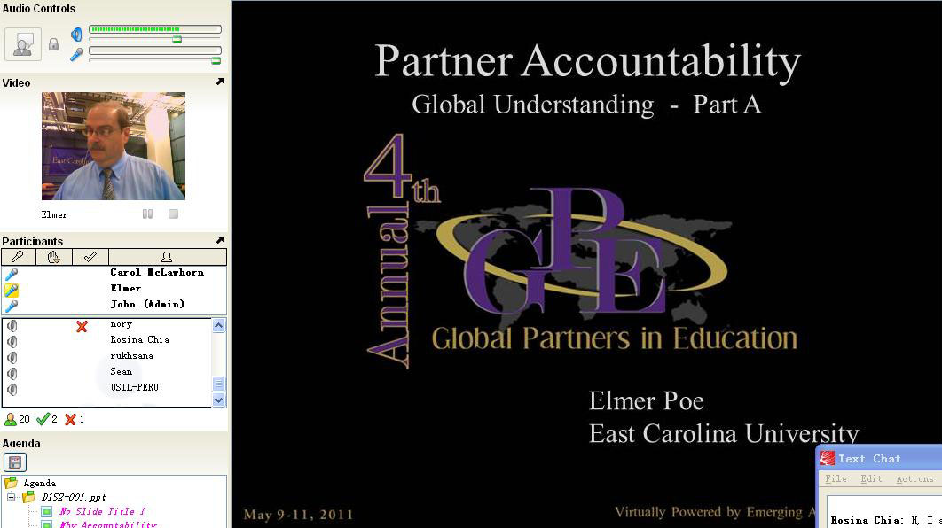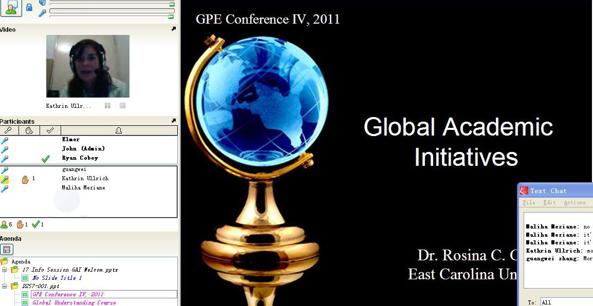 第四届“国际教育合作伙伴”大会(Global Partner in Education,GPE4)于5月9日至11日召开。此次会议会址原定在阿尔及利亚,由于北非近来局势动荡,改由美国东卡罗莱纳大学主持举行虚拟网络视频会议。该组织合作方全球22个国家的32所大学通过国际互联网实时与会,会议盛况空前。会议对“国际教育合作伙伴”协会(GPE)这一国际教育合作机构这些年来取得的成就以及“世界文化交流”(Global Understanding)这一跨文化项目的开展做了充分总结,对其未来发展进行了规划和展望,并针对教学方法、学生参与度、技术支持和更新、论坛建设、论文发表、项目管理、合作伙伴职责等方面进行了认真讨论,所有参与方对目前的存在问题和解决方案达成了一致认识。我校威尼斯欢迎你welcome作为合作单位,学院领导与任课老师在学院多媒体教室参加会议并提供了多媒体会议发言材料。此次全球虚拟网络视频大会圆满成功。