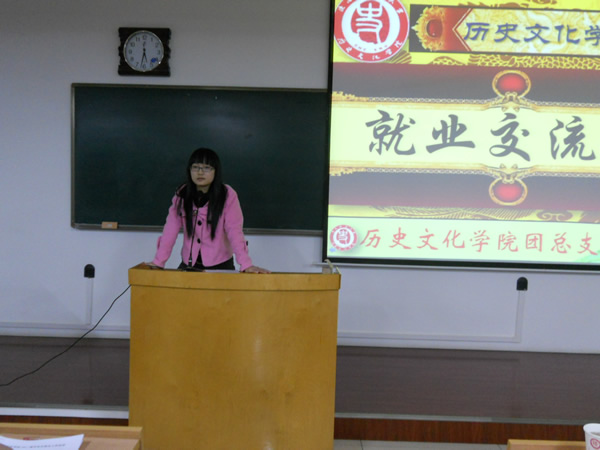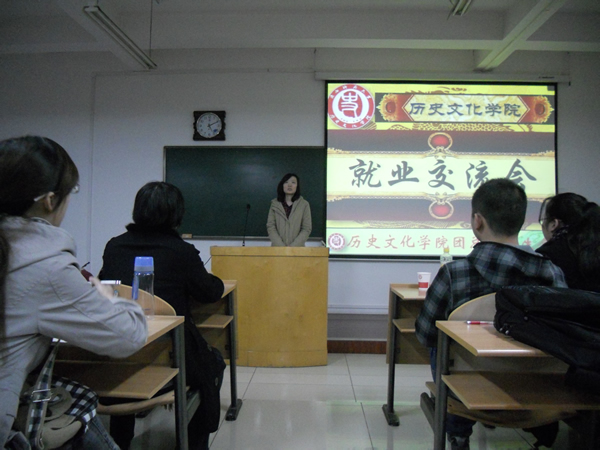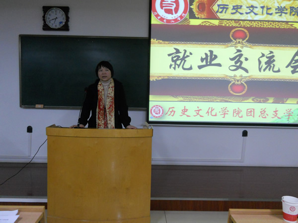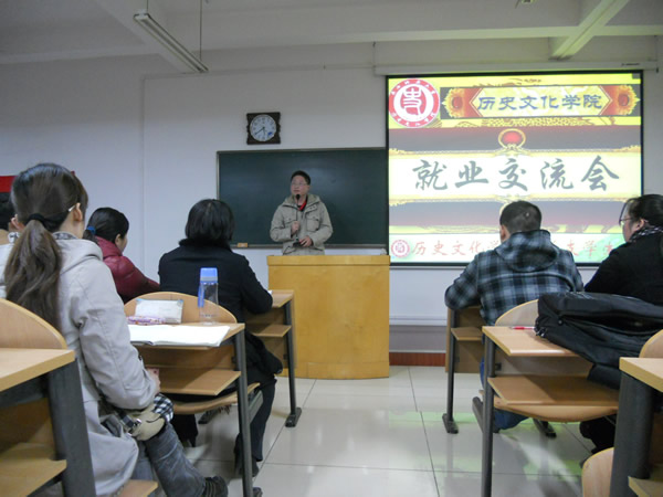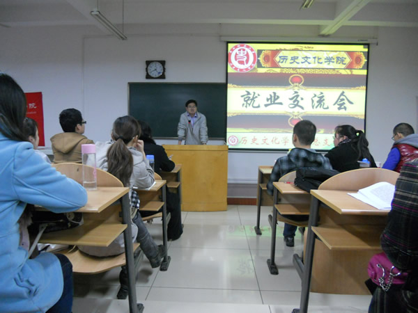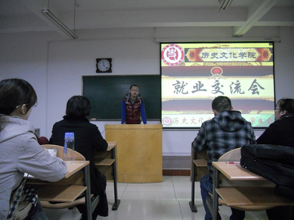 几位学生代表分别介绍了自己的求职经历和就业情况,并就一些细节与大家展开了讨论,分享了自己的心得体会。2009级研究生郭圣银结合自身的公务员考试经历,指出个人努力是基础,把握机遇更重要,要有坚持不懈的毅力;2008级历史学二班的冯敏提醒大家面试时要特别注意自我介绍,同时要注意礼貌,体现师大学子的优秀素养;来自新疆的魏薇和大家分享了自己的求职经过,建议大家充分做好求职信息的搜集工作,注重教学实践和班级管理经验的积累,做好职业定位,熟悉招聘流程,并且要及时反思,积累经验教训;历史学一班的张建春寄语大家,选择比努力重要,坚持比能力重要,细节决定成败,机会永远给有准备的人,要为自己设立高标准、高目标,激励自己奋进;历史二班的李嘉结合自身的求职经历强调指出一定要充分准备,谨慎选择,保持积极的状态,选取适合自己的职业和生活;2008级博物馆班的伍苏明在分享自己的经验时建议多和学院老师沟通,在汲取知识的同时也要注重实践能力的锻炼,知行合一。