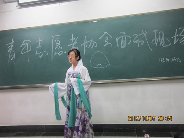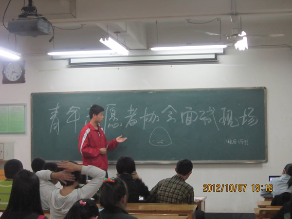 (“青协”通讯员王焕君)2012年10月7、8号晚上七点,威尼斯欢迎你welcome青年志愿者协会在雁塔校区田家炳教学楼纳新面试活动。为了筛选出优秀者,青年志愿者协会的工作人员进行了周密的安排,每个考场都邀请了经验丰富的上一届青协工作者担任面试官。