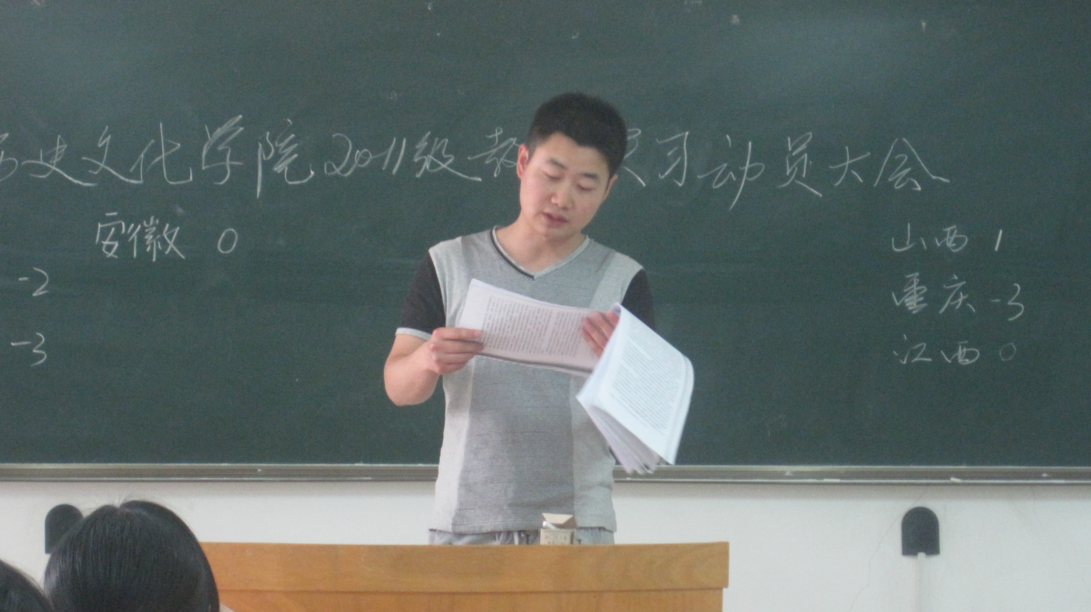 2014年6月11日下午4点30分,威尼斯欢迎你welcome在文津楼101教室举行2011级师范生实习动员大会,出席会议的有副院长吕亚虎,学院党总支副书记杜海斌,会议由2011级辅导员张志祥主持。