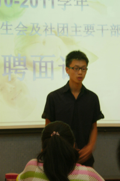 面试中,各位候选人在简短的自我介绍和对竞选职位的工作设想环节中各显身手。在被问及对各部门的管理有何建议以及活动的策划与创新等问题时,各位候选人从精简部门人员、完善工作制度、紧抓工作质量、打造品牌活动等方面提出了自己对部门发展的构想。他们的陈述形式新颖,自信洋溢,表达流畅,表现出同学们良好的思考能力、应变能力、语言表达能力和综合素质。