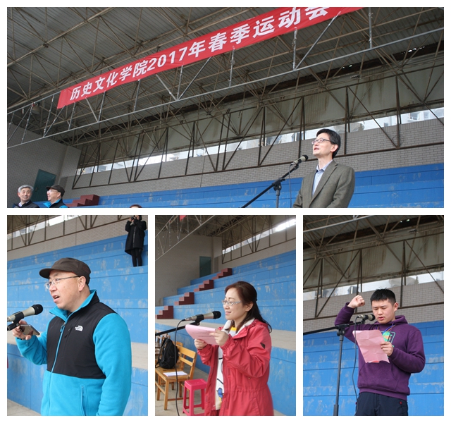 大会首先由院长何志龙致开幕词,他对筹备本次运动会辛勤付出的全体裁判员、运动员和工作人员表示了诚挚的感谢,鼓励同学们在尽情挥洒青春与汗水的同时发扬友谊第一、比赛第二的体育精神,祝愿同学们在体育场上赛出精神赛出风貌、收获快乐。接着教师运动员代表梁志胜老师发言,他说:“春雨如酥,春风如沐,有点阴霾,不用发怵,淑女绅士们齐头上阵,要与春风一起飞”。梁老师以幽默风趣的语言赢得全场雷动。接下来由2015级薛嘉琛和汪子昱同学分别代表运动员和裁判员宣誓。最后,学院工会主席韩小忙老师宣布本次春季运动会正式开幕。