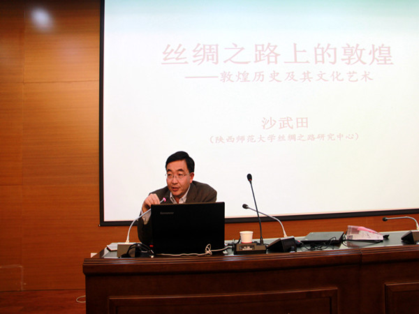 会议开始,副院长郭艳利老师向大家介绍了此次带队教师,并对此次敦煌考察的相关注意事项进行了简要说明,希望同学们能做到遵从纪律、服从大局。随后,学院党委副书记程蕾老师对考察的相关注意问题做了补充说明。程蕾老师希望大家始终把自己的人身财产安全放在第一位;在人多时长的情况下能有很强的组织性和纪律性,做合格的师大学子;同时小组成员之间要形成一种团结友好的氛围;希望同学们及时记录自己的考察心得,充实自己的考察之行;最后程蕾老师预祝大家顺利完成考察,安全返校。为了进一步增强同学们对此次考察知识的了解,学院特意邀请沙武田教授做了《丝绸之路上的敦煌--敦煌历史及其文化艺术》专题讲座,沙武田教授分别从两关文化及其人文情节、汉文化的边疆守护、敦煌文化的民族性、华戎所交一都会、敦煌的佛教文化、藏经洞的文献与文物、敦煌与长安之间的关系、国际显学的号召力与魅力、一带一路新时代背景下敦煌的历史担当九个方面来阐释“丝绸之路上的敦煌”。在讲述过程中,沙武田教授辅以大量珍贵和精美的照片,图文并茂,博引中外,耳目一新,令大家受益匪浅,更加激发了同学专业教育实践的兴趣。之后,沙老师当场解答了几位同学提出的问题,现场气氛活跃。