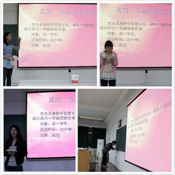 之后,进入了此次活动的核心环节:“我的一节诚信班会课”。由于同学们马上要走上实习岗位,而作为未来的年轻班主任如何管理班级和学生,如何开展班会课等都是必将经历的,故以此来号召同学们积极学习和探索班级管理技能和方法,以免将来措手不及。此活动环节要求同学们通过分组讨论和策划,并以高一学生为活动对象而设计一节诚信主题班会。同学们参与热情很高,但由于时间的限制,由六位同学上台展示和讲解了自己的设计思路。从总体上来看,同学们视角新颖独特,思路清晰,从目标出发,小处着手,大处着眼,摆脱道德说教的形式,注重思辨,强调教师引导为辅,发挥学生的主体性。在活动中,嘉宾们对六位同学的精彩展示做了点评,并提出了一些意见和看法。为了调动同学们的积极性,还特意准备了班主任专业书籍、笔记本等奖品。奖励虽然微薄,但背后却是无限的期待:希望和祝愿同学们不懈努力,加强班级管理等教师技能的培养和锻炼,立志做一个专业的班主任、合格的“人师”。