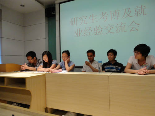 在胡莉同学简要介绍后,会议正式开始。首先,考博的学长学姐分别讲述了他们在考博过程中的一些经验。荆小勇学长讲到收集“情报资料”的重要性,如某个老师的招生名额、有没有报送生等;李珍珍学姐强调了在备考的过程中要认真、踏实的学习,勤能补拙;霍斌学长讲在联系导师时态度要谦虚,同时也讲到了选择学校、老师的重要性。彭贺超学长也讲到一些注意事项,如报学校不宜过多,因为精力有限。