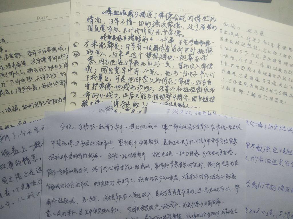 首先,全班同学共同观看了一部优秀的抗日题材战争片《喋血孤城》,影片以1943年抗日战争为背景,讲述了国民党第74军57师八千将士在师长余程万的带领下,与三万精锐日军展开殊死守城对抗战的故事。在明知弹尽、援绝、城已被弃的情况下,八千“虎贲”坚守孤城常德,以一轮接一轮的牺牲,拼死抵抗三万精锐日军猛烈进攻。 看完电影后,同学们感触很深,纷纷表达自己的想法。杨一凡同学谈到:“2015年是世界反法西斯战争胜利70周年。70年前中国人民经过八年艰苦卓绝的抗战,取得了抗日战争的伟大胜利,为世界反法西斯战争的胜利做出了巨大贡献。我们应不断努力奋斗”;李小刀同学则把影片与现实联系起来,指出责任意识与担当精神的重要;其他同学也都将自己的感想写了下来。