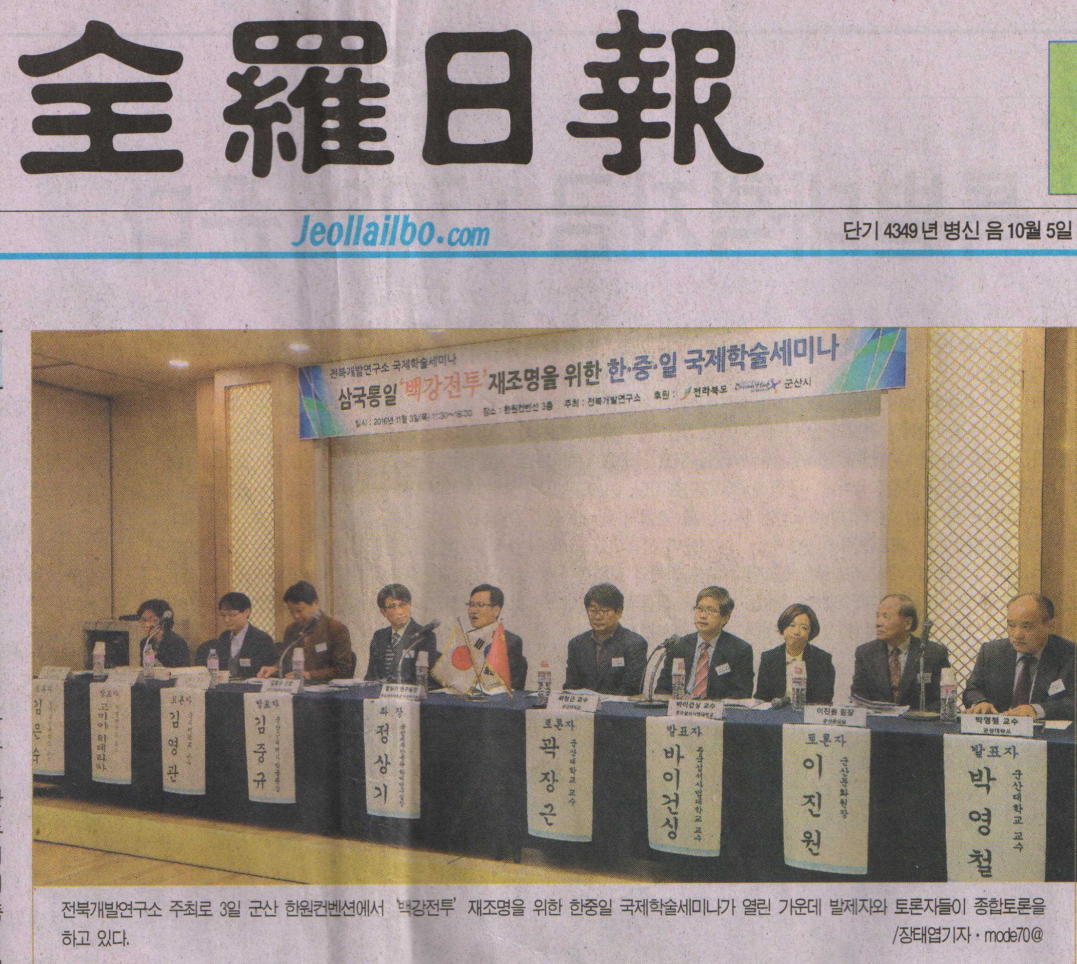 会议中,韩、中、日三国的四位学者宣读了各自的论文,集中探讨白江战斗发生的地域性与国际意义等问题。拜教授提交并宣读论文《唐朝新罗联合与白江口之战的新探索》,受到与会专家学者的关注和好评。在讨论互动中,拜教授回答了论文评议者提出问题的同时,还对其他与会学者学者的论文发表看法。韩国《全罗日报》在4日头版显著位置报道了这次国际学术会议盛况,并在第4版刊出拜教授等学者的照片,重点介绍他们的学术观点。