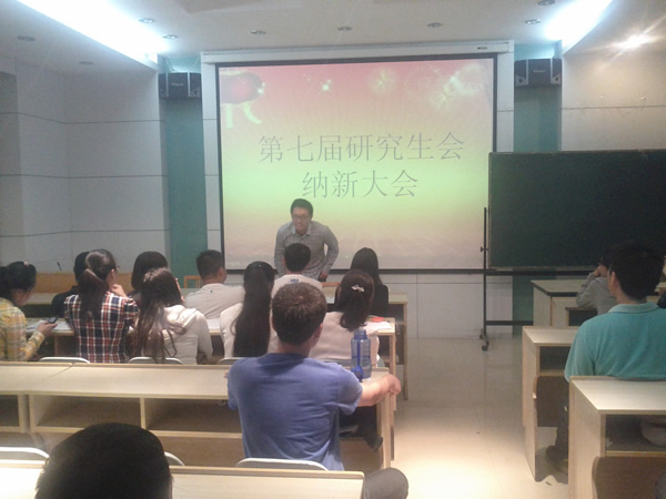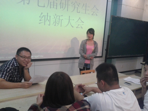 大会于晚7点正式开始,研会副主席韩敏首先对2012级参加纳新的同学表示热烈的欢迎,接着她详细介绍了研会各个部门及其职能。随后,研会主席秦琼同学发言,他介绍了研会的规章制度,并对以后的工作进行了展望,他指出研究生会是锻炼自我、提升能力的平台。接下来,大会把时间留给了前来参加竞聘的同学,同学们纷纷上台做自我介绍及演讲。他们可谓多才多艺,唐朋对自己办公室助理一职工作经验的总结,朱闪认真而严谨的陈述,赵星宇在演讲之外更是为大家献上一首陕北民歌,使现场气氛达到高潮。竞聘过程中,同学们都认真回答研会主席及各部部长提问的一些问题,并对研会的工作提出了一些宝贵的建议。
