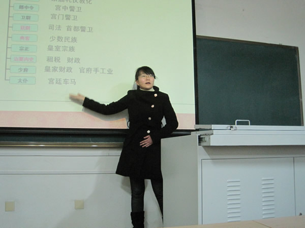 在主持人宣读完比赛规则和奖项设置后,比赛正式拉开序幕。选手们按预先抽签的次序一一登台进行比赛,他们讲授的主题涵盖了古今中外历史的诸多方面,在规定的时间内向在场的老师和同学们展现了自己扎实的专业知识和语言表达水平。杨丽萍同学运用地图、图表讲述了文艺复兴时期意大利经济发展的原因,条理清晰,表述准确;叶子龙同学充满激情的向大家讲述了英国的制度创新,思路清晰,语言富有感染力,将本次讲课比赛推向了高潮;白雪、柳凡两位同学引领大家重温了中国近代那段战火纷飞的历史。