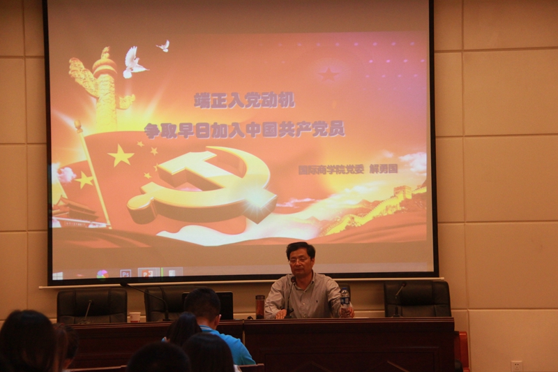 开班典礼结束后,本期入党积极分子第一节党课培训正式开始。国际商学院党委书记解勇国老师为大家做了以“端正入党动机,争取早日加入中国共产党”为题的讲座。解勇国老师以入党动机为主体,从树立正确入党动机的要求、端正入党动机的主要实践途径、争取早日加入党组织等方面展开了讲座。对大家提出了严格的要求,希望大家树立正确的党员标准、为人民服务的态度,争取早日加入中国共产党。
