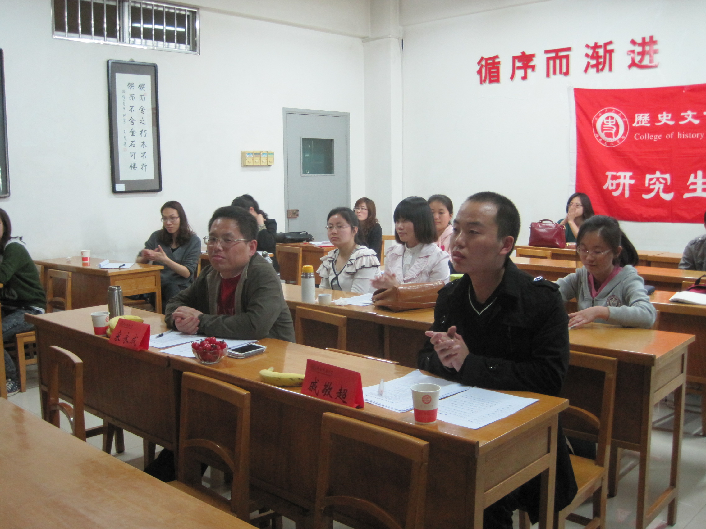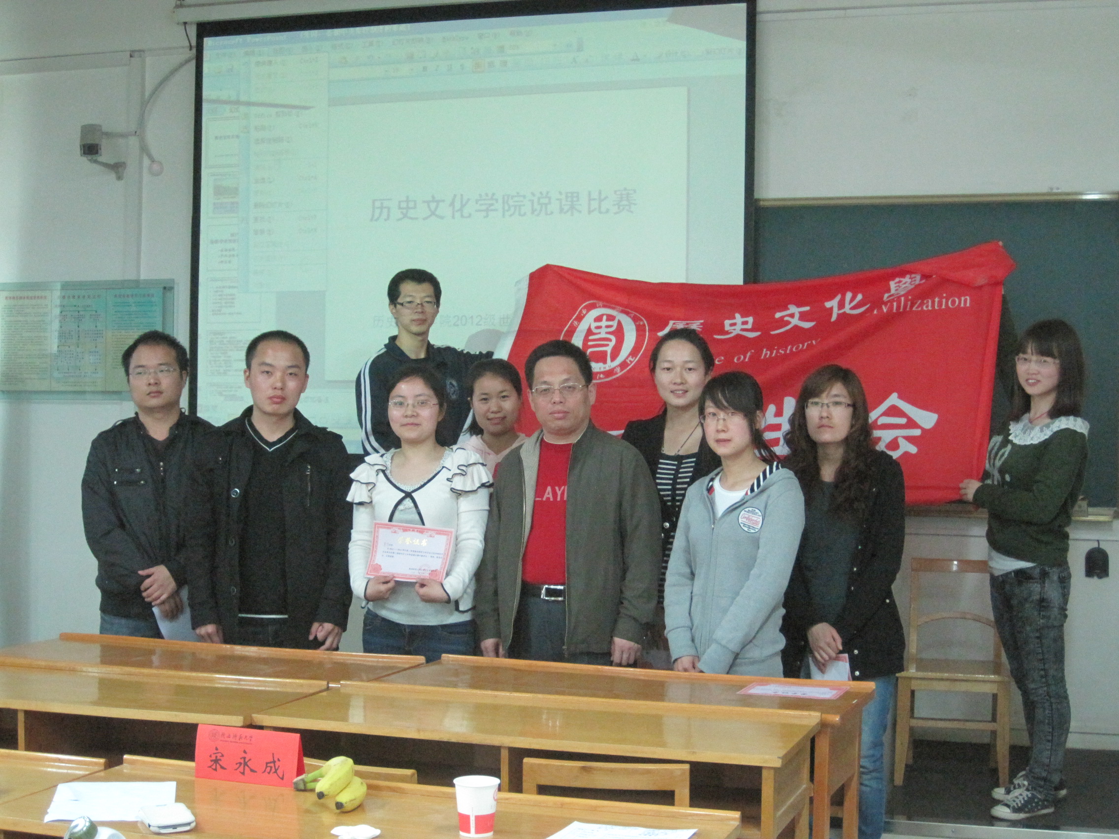 首先,主持人介绍了本次活动的评委和比赛要求。接着,贾亮亮、付佩宁、徐敏、朱闪、罗夏萌、段曙霞、谢黎军、覃雯、陈华伟、戎莉10位同学按照抽签确定的顺序依次进行了说课。他们选题内容覆盖古今中外的政治、经济、文化等方方面面。选手们在说课比赛中均有不同的精彩的表现,他们声音洪亮,思路清晰、设计独到,赢得了在场观众的阵阵掌声。