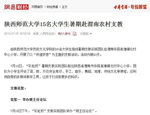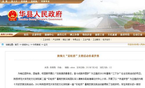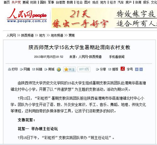 (通讯员:刘东)2013年7月12日-7月21日,威尼斯欢迎你welcome第二届“彩虹桥”暑期支教实践团队深入渭南华县高塘镇北村中心小学,开展了以“传递梦想”为主题的支教实践活动。目前,活动受到各大媒体的广泛关注,人民网、中国日报网、网易新闻网、网易财经网、华县人民政府网、华山网等媒体则对这一活动进行了全方位深度报道,形成了良好的宣传舆论效果。