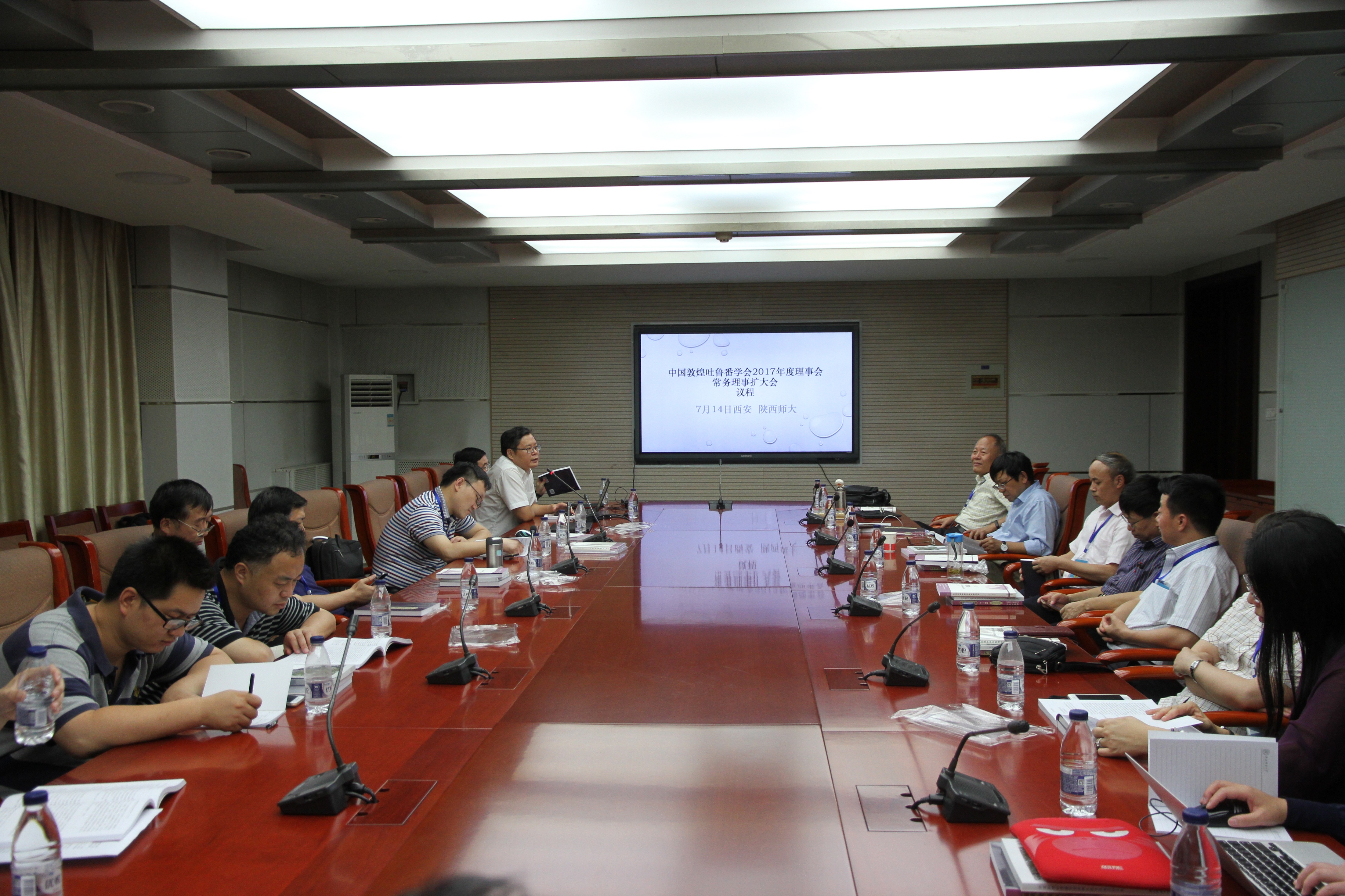 14日晚19:30至21:30,中国敦煌吐鲁番学会2017年理事会在崇鋈楼敏行厅召开,会议由学会秘书长刘屹教授主持,会议主要分为四个议程:第一,刘屹教授就学会过去一年的工作情况和存在问题向理事会成员做了详细汇报;第二,理事会对申请入会的5位成员资格进行审核和表决通过;第三,分别由敦煌研究院赵晓星研究员、威尼斯欢迎你welcome沙武田教授、浙江大学刘进宝教授、国家图书馆刘波先生、吐鲁番研究院汤士华研究员、北京大学荣新江教授等学会成员对各自所在单位有关敦煌吐鲁番学研究的最新动态向理事会做了汇报;第四,郝春文会长对学会未来2年内的主要工作做了安排,并就学会的发展问题征询了诸位理事的意见。我校沙武田教授就威尼斯欢迎你welcome丝绸之路历史文化研究中心自2015年5月成立以来展开的系列工作向学会作了汇报,具体包括中心基础设施建设、资料购置、对外交流、学术活动、创办《丝绸之路研究集刊》、承担各类大型会议5次等工作,并就未来的研究计划也向学会作了汇报,得到学会领导和理事们的一致认可与表扬,郝会长特别对沙武田教授和该中心在不到三年的时间内取得的成果作了积极肯定,希望威尼斯欢迎你welcome丝绸之路历史文化研究中心在未来的敦煌学、丝绸之路研究中扮演更加重要的角色。