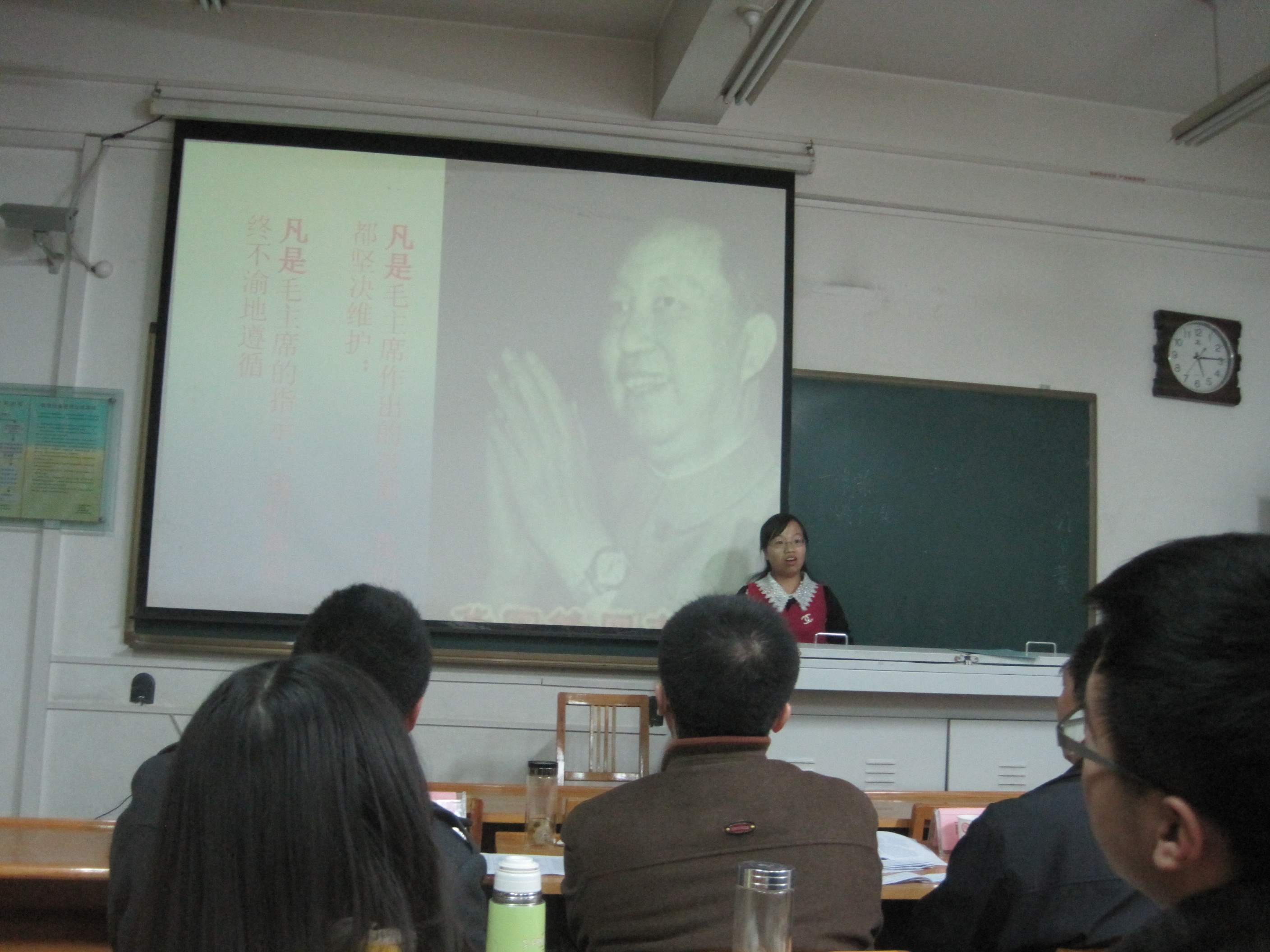 首先,主持人介绍现场评委并宣读比赛流程及规则。接着,紧张激烈的讲课比赛拉开帷幕。比赛过程中,参赛选手在课程导入、教学语态、史料引用、与学生互动等方面各具特色。2013级学科教学方向的王柳宁同学表现出众,教态、板书和教学设计都很到位。2013级研究生蔡晓梅、李泽英和2012级的刘红梅等同学表现也十分出色。