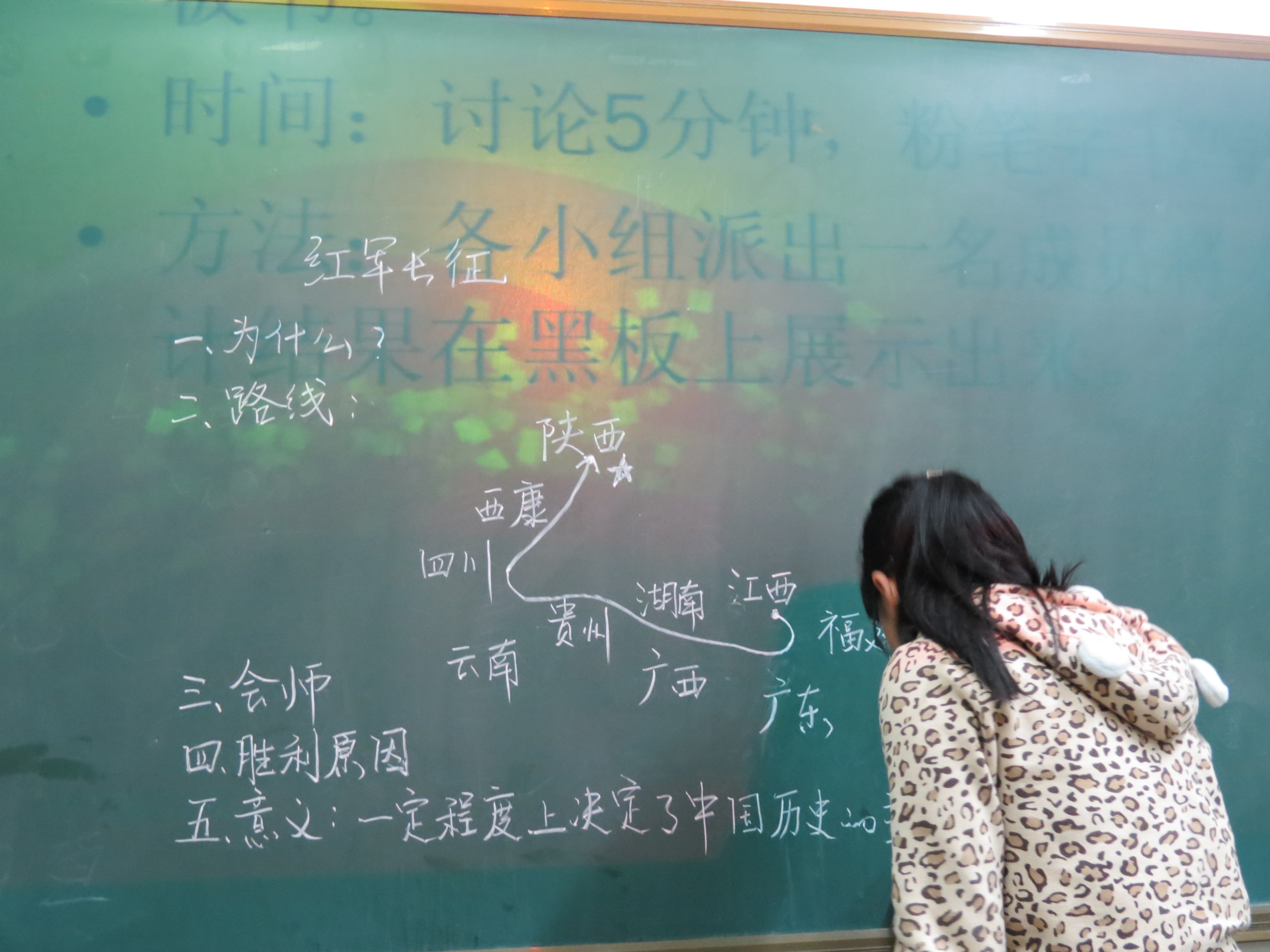 本次活动在团歌合唱及十八大精神回顾中正式拉开帷幕,在主持人的安排下将一班同学分为八组进行以“长征”为主题的板书设计书写大赛,同学们经过一番热烈讨论各组代表先后在黑板上展示;随后,活动进入“教师成长之路故事系列”环节,王琴与吴蒙同学向大家分享了暑期社会实践经验,均强调“尊重学生”的重要性;活动第三部分,“小游戏”以及“敦煌笑点放送”将活动推向高潮,这个环节中大家在笑声中回顾了敦煌点滴,回首过去更好展望未来。活动接近尾声,辅导员张志祥老师公布板书设计书写大赛获奖名单,并对活动做了总结性发言,充分肯定了历史一班学生积极态度和良好的精神风貌。最后到场嘉宾与一班同学进行合影留念。
