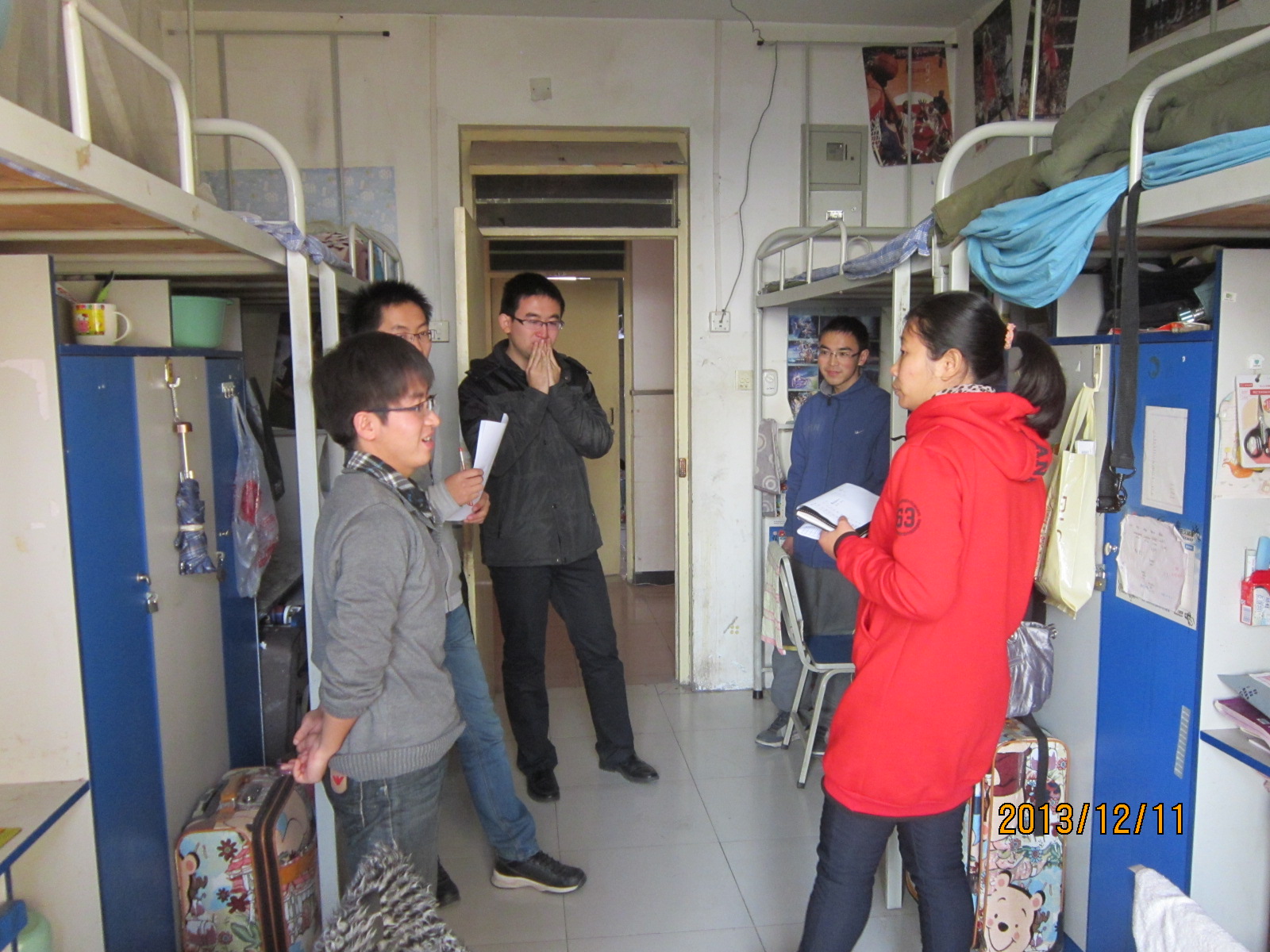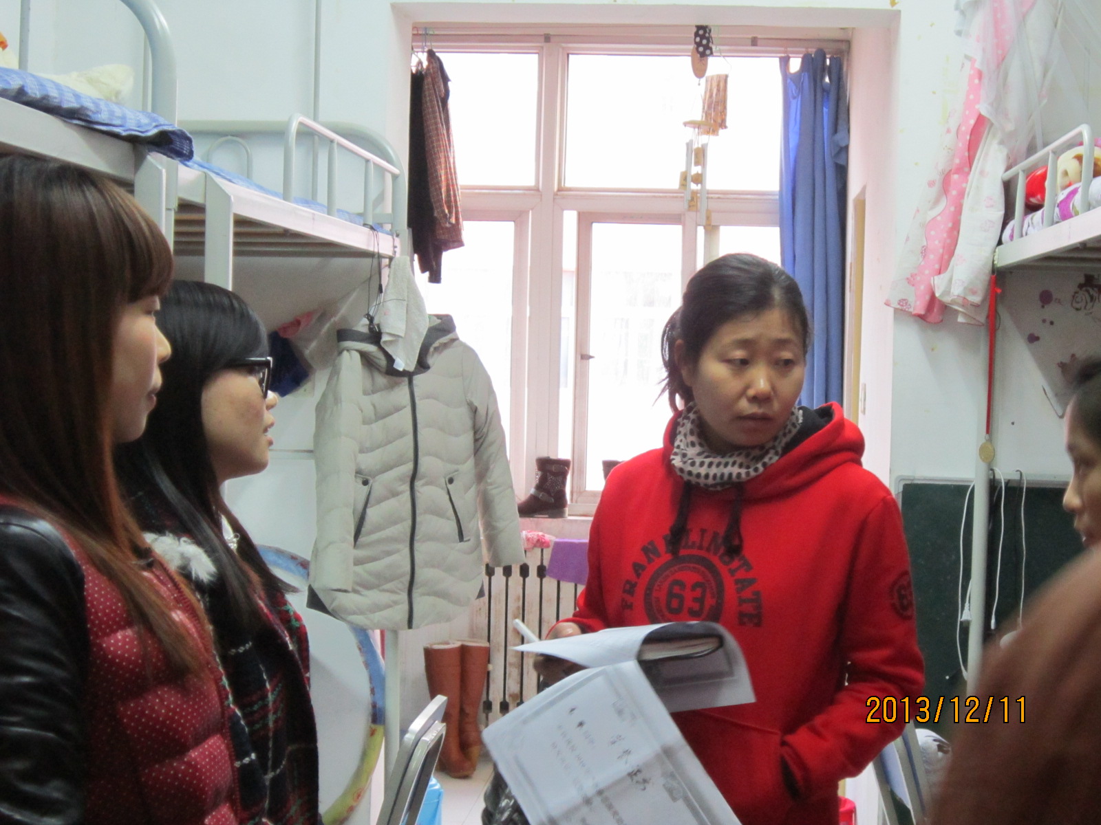 2013年12月11日本周三下午4点,洪海安、刘洁婷二位老师、学生会主席团成员和各班代表对大二、大三、大四各宿舍进行了卫生评比以及大功率电器的检查。