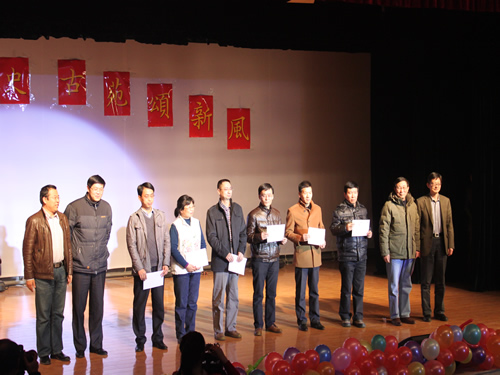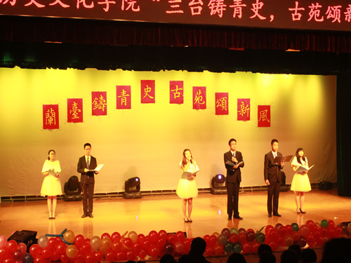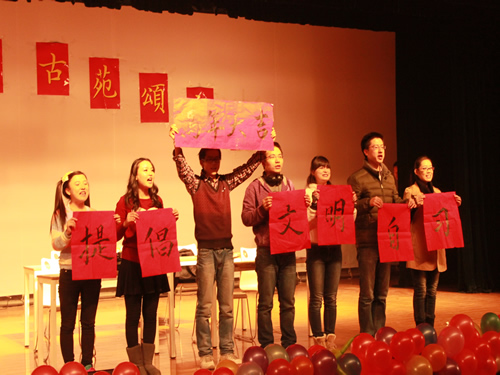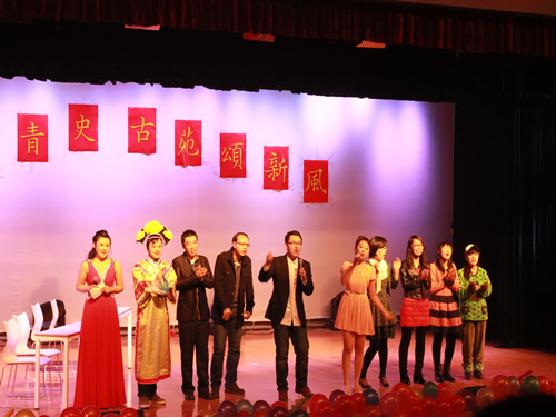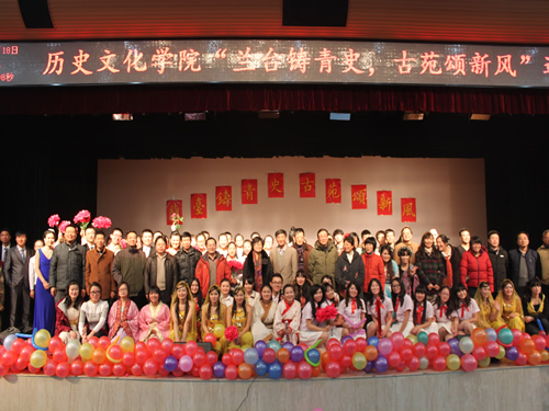 在为最受学生欢迎的教师颁奖之后,大家期待的历史剧《薄暮君王》登台了,在剧中,同学们采取反串的手法,将汉武帝、皇后和妃子等角色惟妙惟肖地展现在大家面前,赢得了一阵又一阵的热烈掌声;出国在外交流的各位威尼斯欢迎你welcome优秀学子通过视频给大家带来了万里之外的新年祝福,普通话流利的外教John先生一曲英文歌之后的中文歌曲震惊四座,引得同学们连声尖叫;慷慨激昂的《大漠敦煌》朗诵仿佛将同学们带回了黄沙漫漫的玉门边关,不由地勾起大家对于敦煌考察之行的美好回忆;《那些年我们一起面过试》通过各种夸张的表演向大家展示了研究生面试的各种风趣场景;陈翔同学以一首《大笨钟》开启了一系列的歌曲联唱,杨丽民同学的少数民族歌曲充满着浓厚的淳朴气息,唐亦功老师及其学生为大家带来的外国小曲充满了无限的母爱温情;2011级历史二班的同学以一出小品《元帝选妃》借古讽今,展示了现在一些选美比赛的种种黑幕;活泼可爱的2011级、2012级历史创新班的女生们以一支热情俏皮的舞蹈《NO NO NO》给晚会带来了另一个高潮。