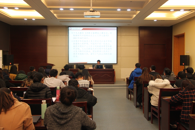 会议第二阶段是由学院党委书记杜海斌老师做了题为“中国共产党历史使命的由来和新征程”的专题报告。报告中杜老师引经据典,从陶渊明的《桃花源记》到康有为的《大同书》,从空想社会主义学家穆尔到中华民国缔造者孙中山,人类追求理想的美好画卷展现在我们眼前。之后,杜老师以“新使命新征程”为切入点,为我们介绍了中国共产党的艰难历程和光辉岁月。杜老师指出新时代的大学生应当是学习上的先锋,工作中的榜样,生活中的好人,这也是入党积极份子为人处世的基本要求。