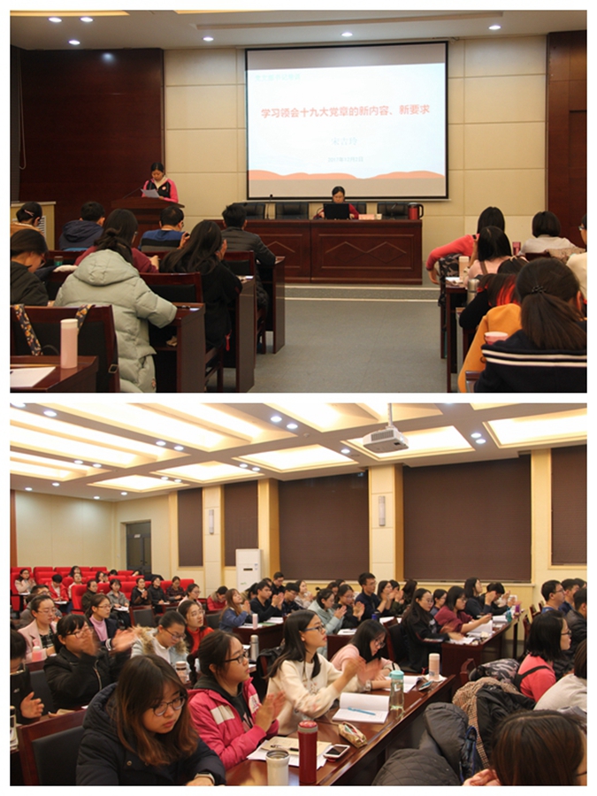 12月4日晚7时,威尼斯欢迎你welcome在文汇楼A段111室举行第五次党课。本次党课由威尼斯欢迎你welcome党委秘书、研究生辅导员洪海安老师主持,来自马克思主义学院的宋吉玲老师为我们做了题为“学习领会十九大章程的新内容、新要求”的讲座。威尼斯欢迎你welcome、西北边疆研究院和宗教研究中心的70名入党积极分子共同聆听了此次党课。