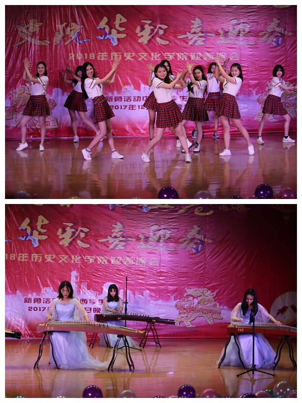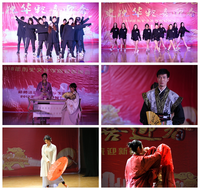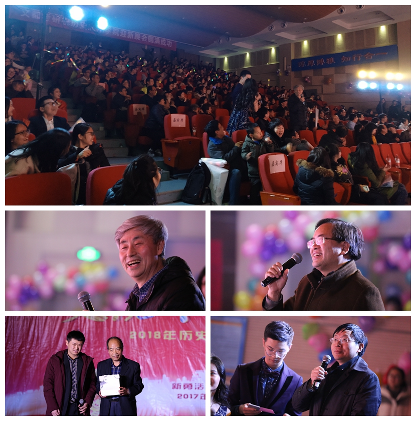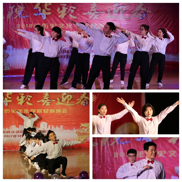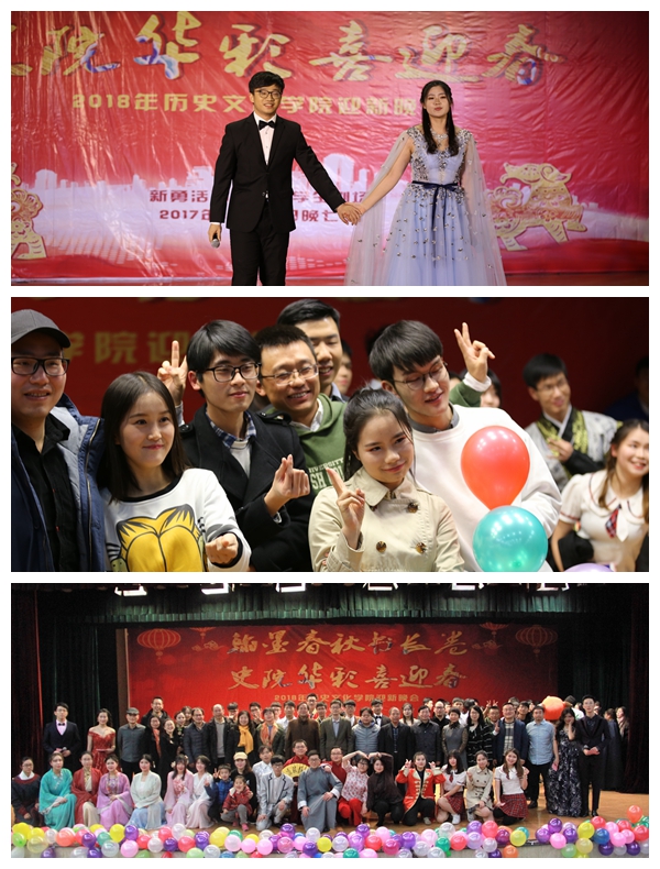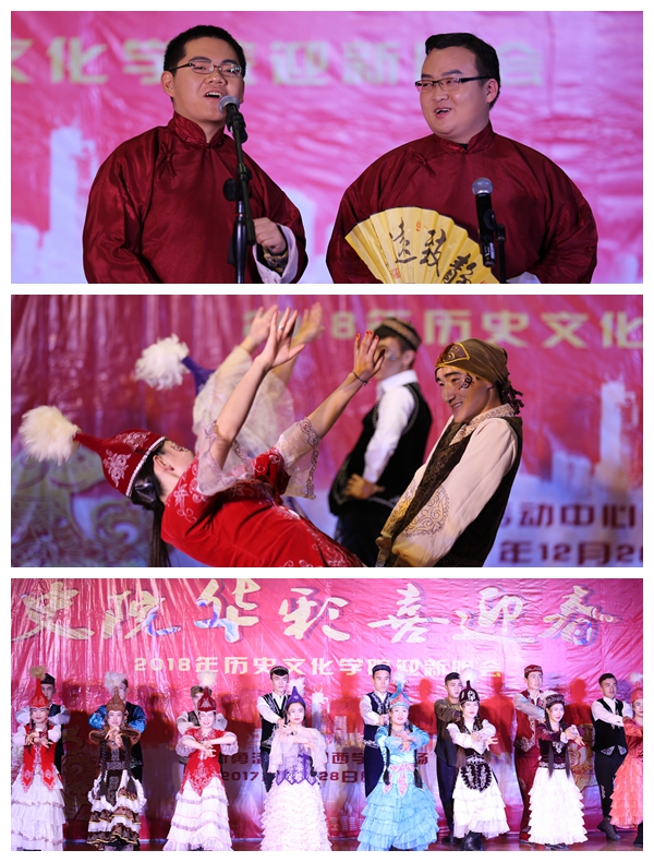晚会现场精彩纷呈。器乐合奏《天山之歌》韵味十足带着观众走进了一个典雅宁静的世界;而相声表演《文艺范儿》结合学生学习生活,逗得台下笑声连连。哈萨克族舞蹈《黑走马》,婀娜多姿的舞蹈将热情传遍了会场的每一个角落。《钦差大臣》的登场,演员们将著名剧作家果戈里的著名讽刺喜剧效果演绎得非常传神,引得现场叫好声不断。随后,由翁彪、于海兵、葛洲子教师与学生联袂表演情景剧《青春纪念册之梦回敦煌》,先是情景再现了师生共赴敦煌考察的日子,回首往事,更觉美好。回忆的列车驶向2018,四位师生合唱了改编版的《青春纪念册》,将晚会带到了高潮。2017级中国近现代史班带来了活泼的舞蹈《第八套广播体操》,让所有人的思绪又回到了中学时代,回味无穷。