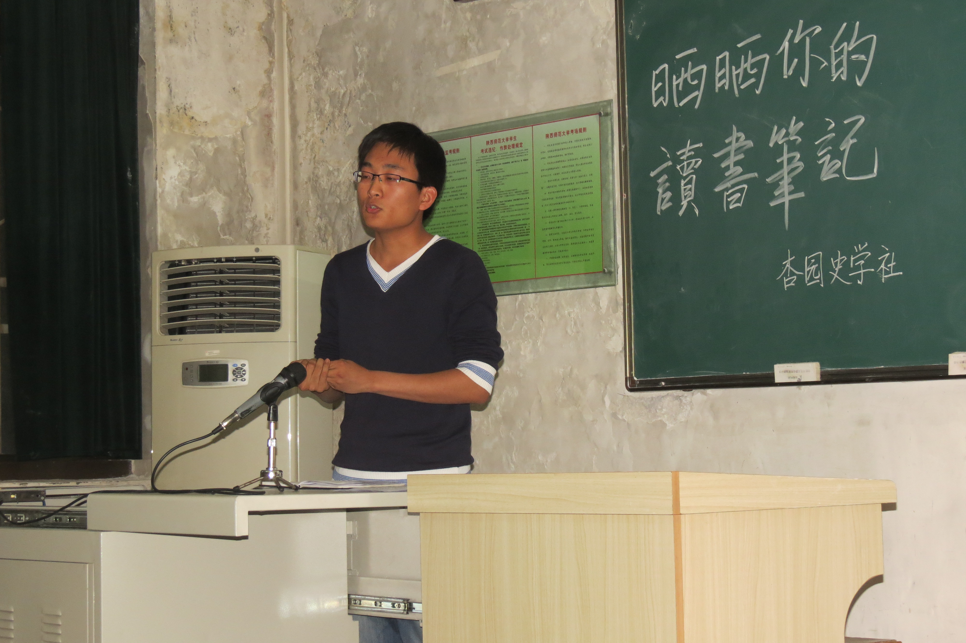 2014年4月27日晚19:00,杏园史学社在雁塔校区5204教室成功举办了社团巡礼月之“晒晒你的读书笔记”读书交流会。威尼斯欢迎你welcome张文安、苏小华两位老师莅临了本次活动,2010级许鑫城、魏镇、徐锦博、段正德四位优秀学长代表也受邀前来,同时参加活动还有2012级、2013级本科生,总计有近百名同学。
