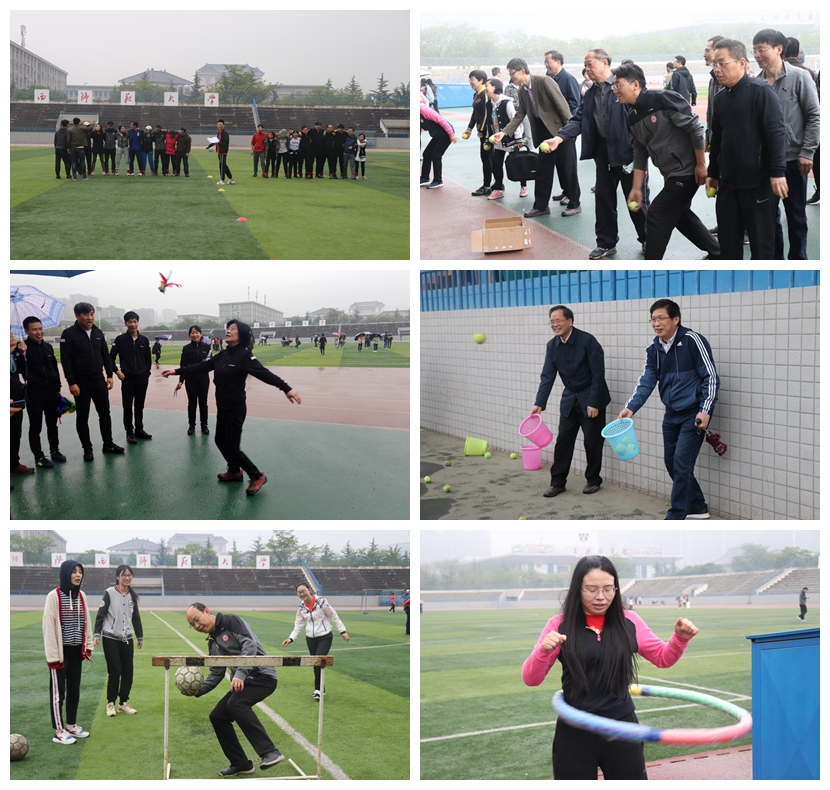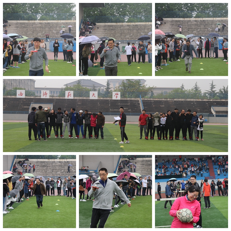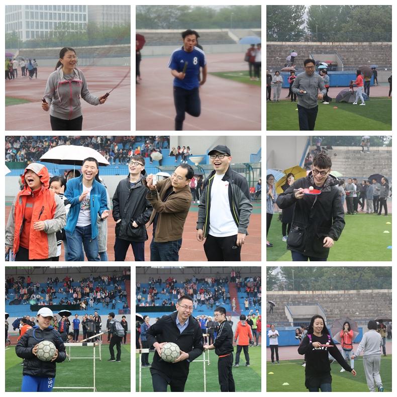 在工作人员充分的前期准备及有序组织下,各类比赛项目紧锣密鼓的进行。首先进行的是各项教工项目,如小球投准、托运乒乓球、跳小绳、呼啦圈以及4*50米接力等,老师们展现出与课堂上完全不同的风采,矫健的身姿与敏捷的动作赢得同学们的阵阵掌声与加油呐喊。师生联合项目和学生集体项目的比赛尤为激烈,尤其是像拔河、4*100米接力赛、和谐动力号火车、跳大绳、袋鼠跳等,同学们为了集体荣誉,个个拼劲全身力气,挥洒着汗水,团结协作,密切配合,展现出良好的集体协作。天空飘着小雨,也没有影响到运动健儿们的完美表现,掌声、欢呼声、呐喊声回荡在运动场上空。