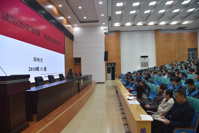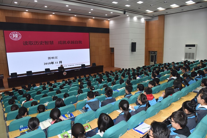 校友丁茜、高二文科部分老师和高二文科全体同学400余人参加了讲座。
