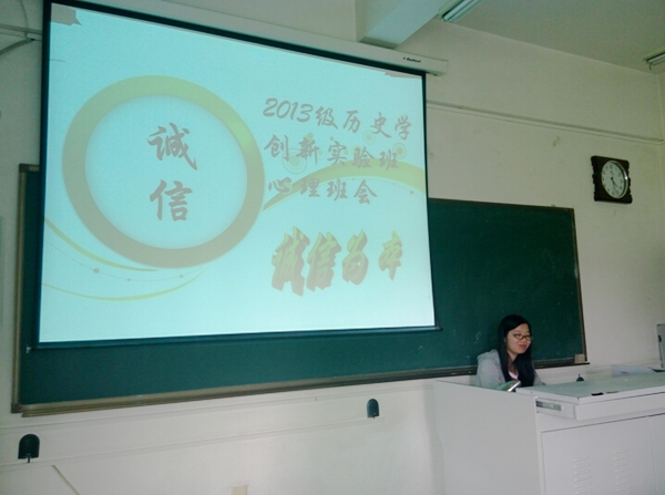 2015年5月11日下午四点半,2013级历史学创新实验班在文渊楼519教室举行以“诚信为本”为主题的心理班会。这次班会由心理委员徐佶心主持。