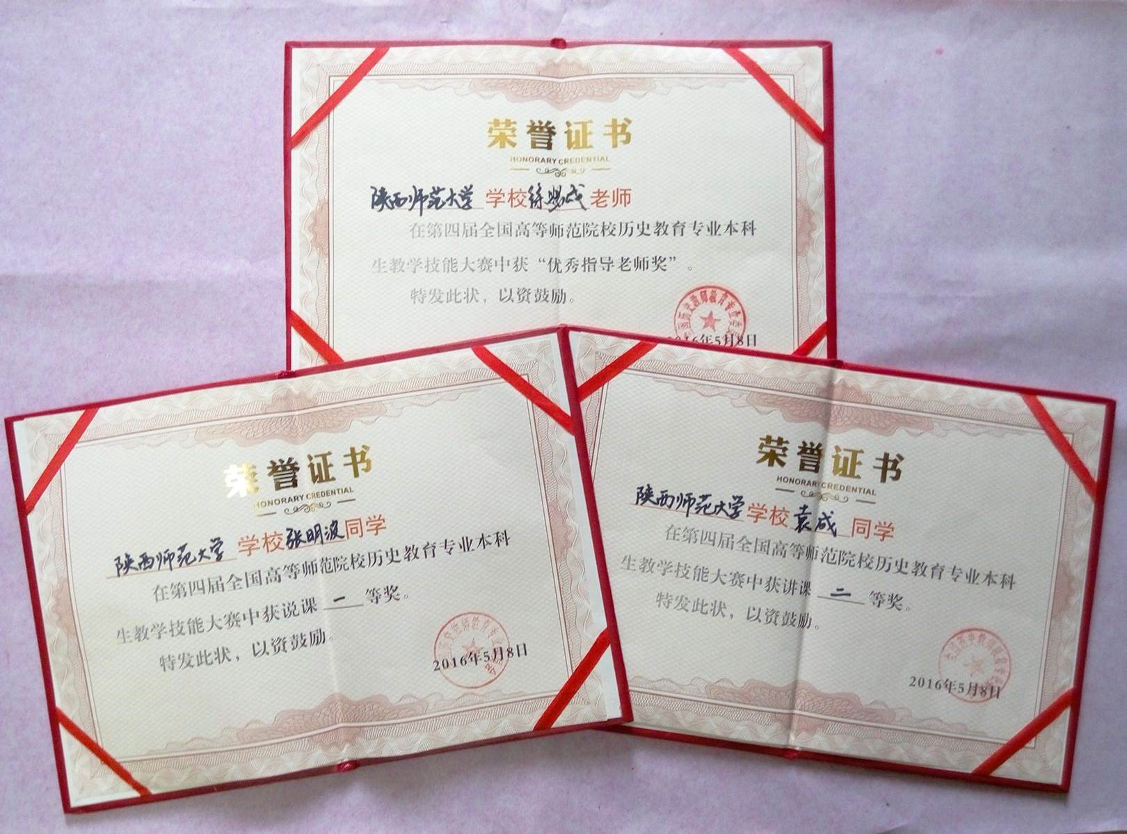 2016年5月6—8日,第四届全国高等师范院校历史教育专业本科生技能大赛在江西师范大学举行,威尼斯官网参赛选手表现出色,取得优异成绩,张明波同学荣获“说课一等奖”,袁成同学荣获“讲课二等奖”,徐赐成老师荣获“优秀指导老师奖”。