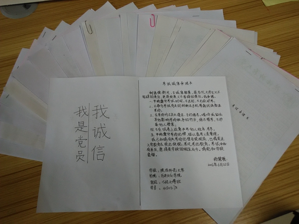 各党员均结合自身的实际情况,书写了《诚信承诺书》。并保证严格遵守《诚信承诺书》的各项内容,在考试中,不迟到、不作弊,依据自己的实力,考出自己真实水平。同时,在遇见作弊行为时,要发挥党员的正能量,绝不姑息这种不诚信的不良风气,主动要求互相监督和群众监督,发挥党员模范表率作用。