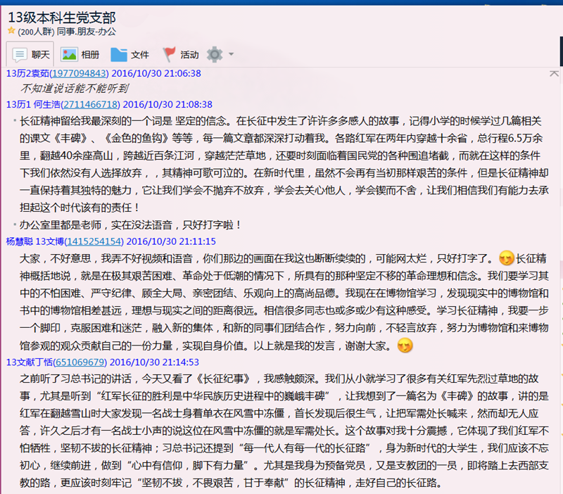 2013级本科生党支部有32位党员,其中在外实习有15位党员,实习地点主要在西藏、新疆、江苏、四川、陕西五个省,支部书记洪海安根据学生实习情况制定“纪念红军长征胜利80周年”网络视频组织生活会具体方案,提前联系学生确定活动时间,并确定了实习点网络视频发言同学名单,在外实习不方便视频的同学通过支部QQ群语音以及文字发言等形式开展讨论,支部委员做好网络视频主会场的前期准备工作。