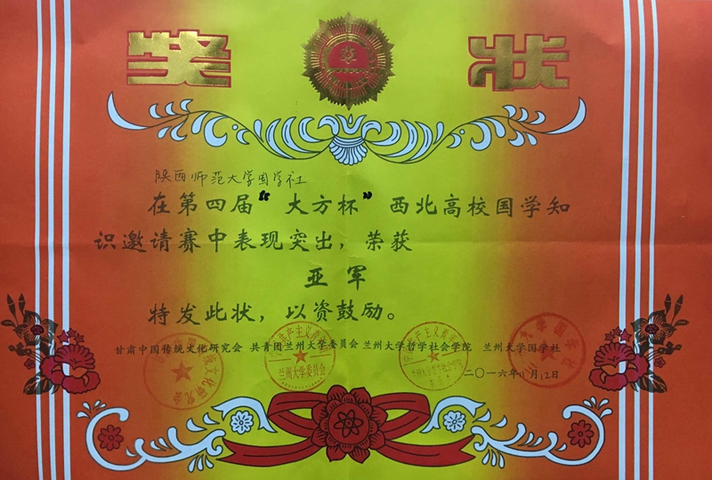 2016年11月12日下午,由甘肃传统文化研究会、共青团兰州大学委员会和兰州大学哲学社会学院联合主办,兰州大学承办的第四届“大方杯”西北高校国学知识邀请赛在兰州大学榆中校区天山堂C302举行。