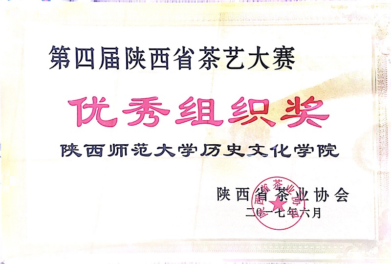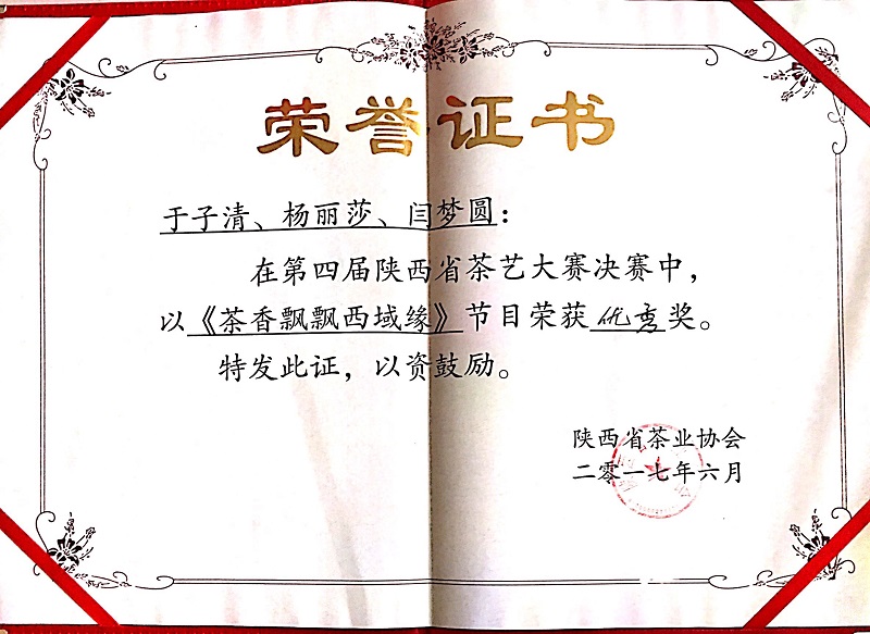 2017年6月11日下午,陕西省茶业协会在西安市曲江国际会展中心B4馆举办了陕西省第四届茶艺大赛决赛。威尼斯官网2015级于子清、杨丽莎、闫梦圆三位同学报送的节目——《茶香飘飘西域缘》通过三轮选拔,最终在决赛中荣获“优秀奖”。同时,威尼斯欢迎你welcome在4月至6月期间积极配合和参与陕西省茶业协会所组织的茶艺大赛相关活动,在最终的颁奖环节中荣获“优秀组织奖”。