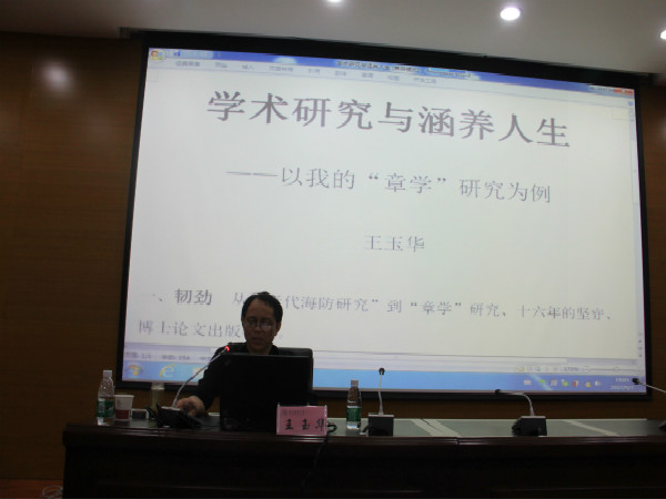 王玉华教授用四个词概括此次讲座内容。一是韧劲,他结合自己的研究经历、述说研究体会、学术经历与个人体悟等方面向大家介绍了什么是“章学”,“章学”即关于晚晴大思想家、教育家章太炎的研究。他指出,目前关于章学的研究成就丰富,但是存在的问题也很多。并向大家分享了“章学”是如何走进他的视野,以及在研究之初遇到的诸多困难,教授说道,兴趣是最好的老师,在兴趣的激励下,有勇于克服困难的韧劲,“章学”自1988年以来一直“跟着他”。二是沉潜。王老师指出,目前做研究,出版的刊物、专著数量很多,但是有“味道”的作品越来越少,让你能一读再读、一品再品的作品越来越少,因此,他鼓励同学们一定要沉下心做学术。如进行“章学”研究,就要先梳理已有“章学”研究成果,下苦工读原典,由易而难寻找突破口。读原典、读一手资料不容易,会有很多困难,所以一定要沉潜,沉潜越深,学术才会做得越有价值。三是博学。他指出知识是相互联系、相互贯通的,比如要学习中古近代史,就应该先了解中国古代史,历史具有延续性,只有这样,才能更好地学习、深入的了解近代历史。因此,他希望同学们多选修一些文学院、哲学院等的课程,拓宽自己的知识面,更好的服务于历史学习。四是低调。王教授说学术是一种生活方式,并不是达到某种目的的工具,不能将学术目的化,并指出“古来圣贤皆寂寞”,只有常年坚守才会有所成就,要能经得住时间的考验。